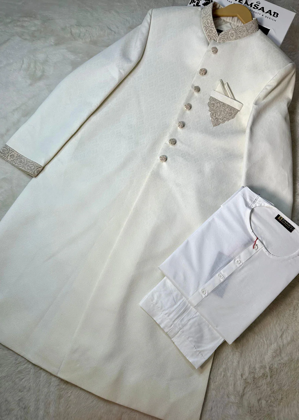Embrace unparalleled luxury in this premium white brocade sherwani, meticulously crafted with exquisite handwork adorning the neckline, sleeves, and pocket. Designed for the discerning gentleman, this ensemble radiates elegance and grandeur, making it the perfect choice for weddings, galas, and other milestone celebrations. The set includes a complementary inner kameez and tailored trousers for a complete, sophisticated look.